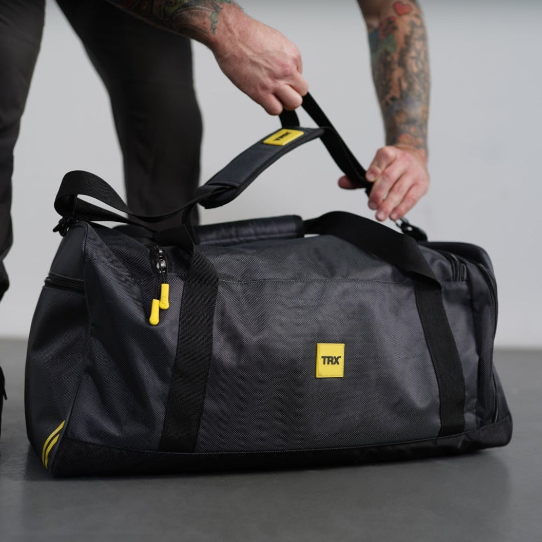 Built for training. Ready for anything. The TRX Performance Duffle is made from a rugged black, abrasion-resistant nylon, and finished with yellow rubber detailing. Offers ample space for essentials, a vented side pocket, and multi-length padded straps. Roomy enough for all your TRX favorites, including a Suspension Trainer, Rip Trainer, and Bandit. Backed by a one-year warranty.